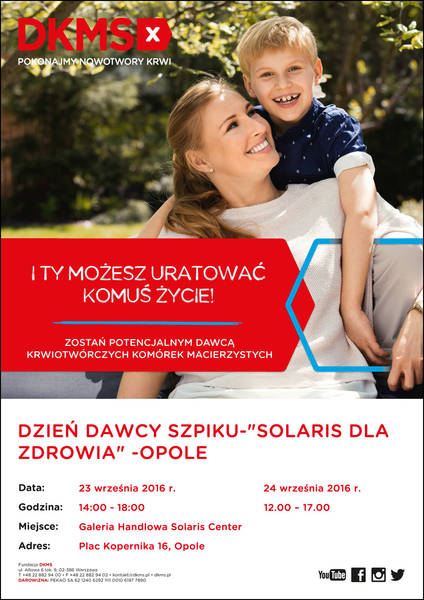 Już w weekend, 23 i 24 września, w Galerii Handlowej Solaris Center w Opolu odbędzie się akcja rejestracji potencjalnych dawców komórek macierzystych krwi lub szpiku dla każdego pacjenta, który zostanie zakwalifikowany do przeszczepienia. Loża Opolska BCC wpiera akcję.