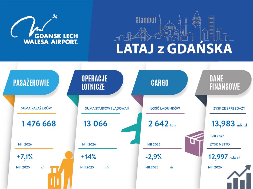 W ciągu trzech miesięcy 2026 roku w Porcie Lotniczym w Gdańsku było 1 476 668 pasażerów. To więcej o 7,1% niż w tym samym okresie 2025 roku. Operacji lotniczych było 13 066, o 14% więcej niż rok temu. Znacząco wzrósł ruch czarterowy.
