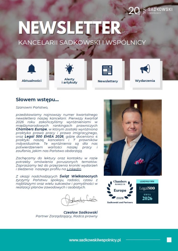 Z przyjemnością informujemy, że ukazało się najnowsze – wiosenne wydanie newslettera Kancelarii Sadkowski i Wspólnicy. To kompleksowe opracowanie, w którym eksperci Kancelarii dzielą się wiedzą i doświadczeniem, prezentując najważniejsze zmiany prawne oraz ich praktyczne znaczenie dla biznesu.
